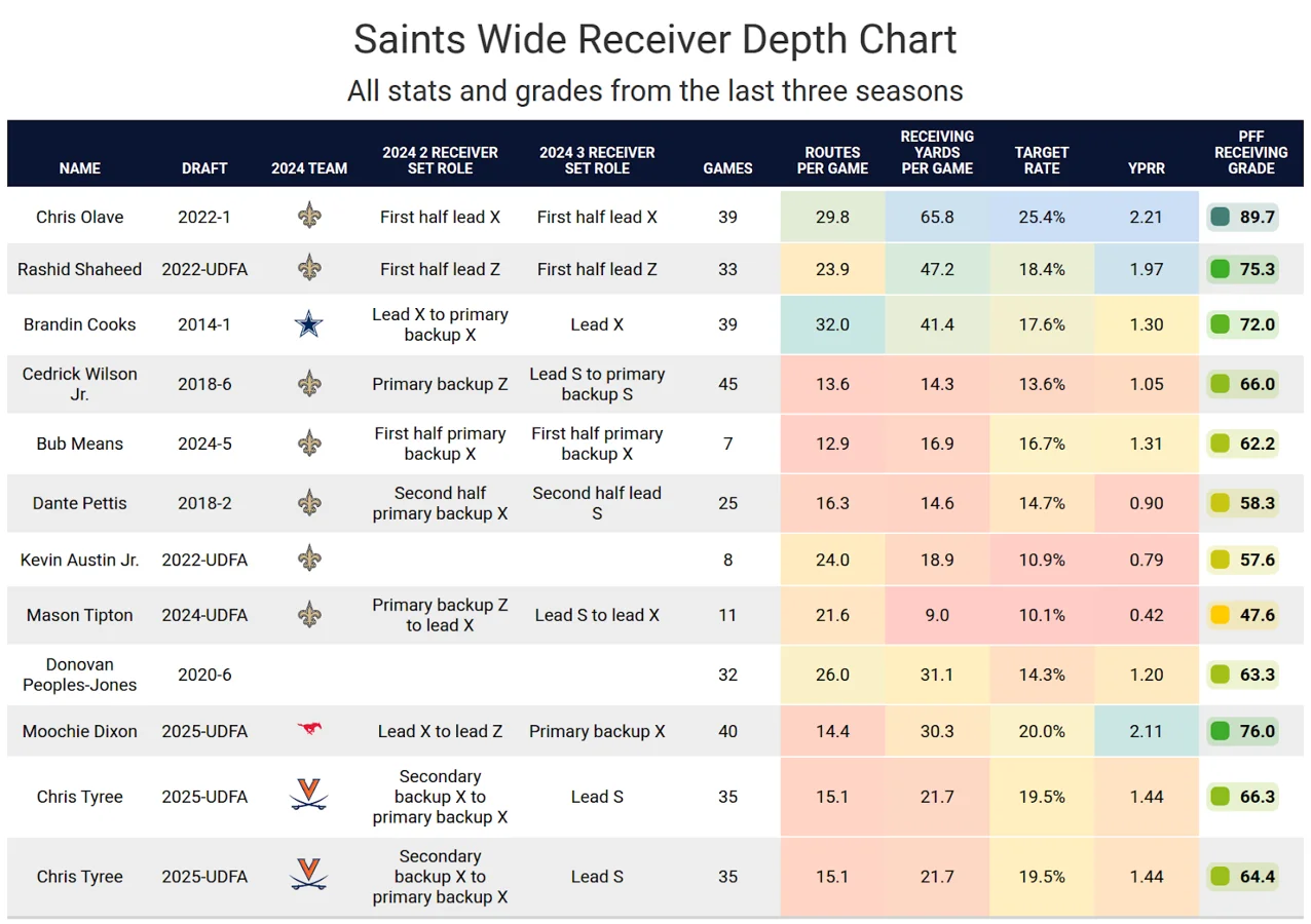 The tight end and running back spaces remained stable, meaning Olave should remain the top option in the passing game, even if Shaheed makes a significant leap after recovering from injury. The volume of passing attempts is expected to remain high under new head coach Kellen Moore, whose offensive philosophies favor heavy wide receiver involvement.
