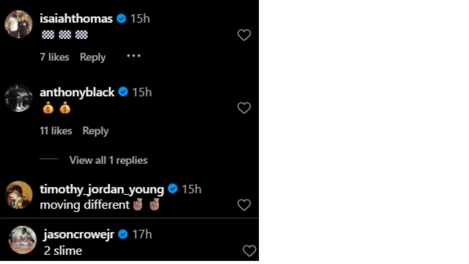 “moving different,” commented Timothy Young with two fingers crossed emojis.