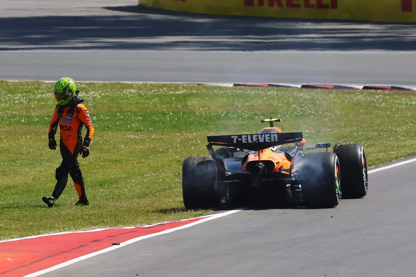 During a duel for fourth place down the main straight in Canada, Norris collided with Piastri’s car by clipping his rear tyre, causing himself to crash into the pit wall.