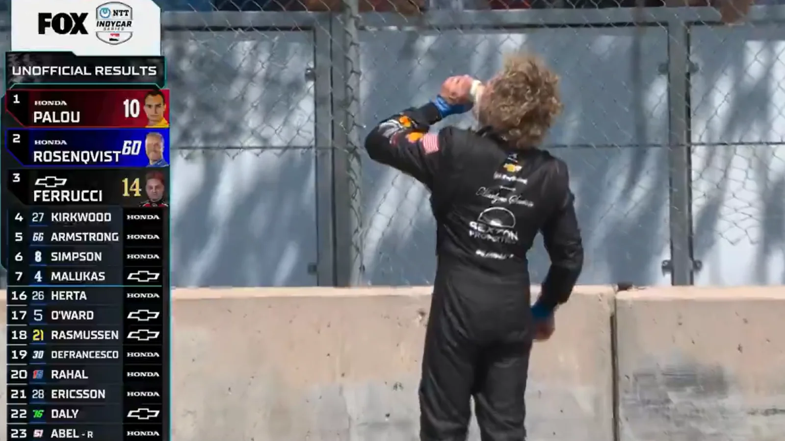 Ferrucci started the race in 18th position and faced a challenging race that required careful fuel management. Despite the difficulties, he skillfully guided his AJ Foyt car to a strong third-place finish. After crossing the line, instead of turning immediately to his pit crew for fluids, he signaled to spectators for a drink. Fans initially handed him water, which spilled, leading Ferrucci to request a can of beer. He then opened the beer and drank it on camera, an uncommon sight in the typically strict post-race protocols.