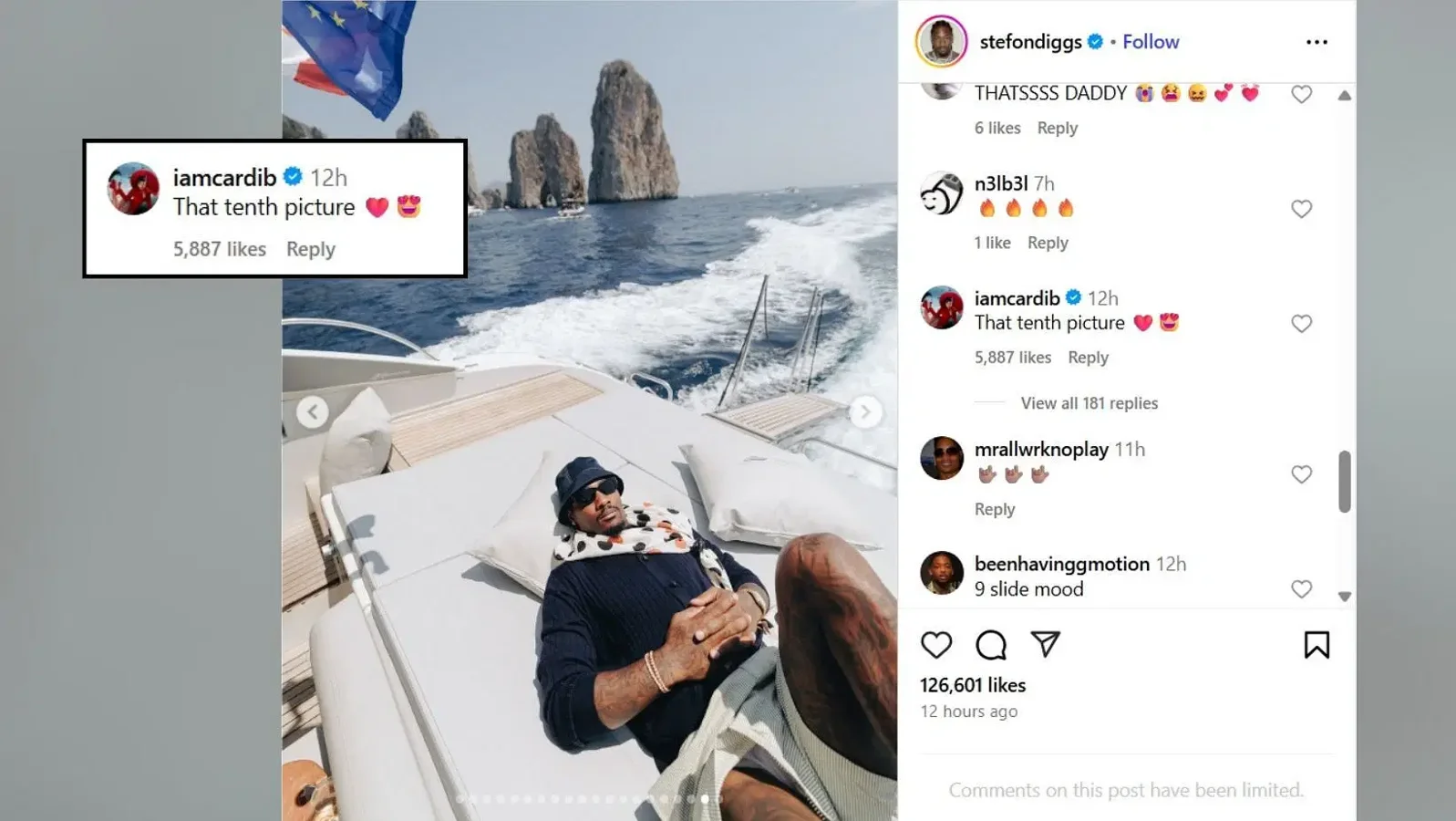 New England Patriots wide receiver Stefon Diggs recently treated fans to a glimpse of his European vacation through a viral Instagram recap posted last Monday. The photos captured memorable moments from his trip, attracting considerable attention from followers worldwide. His girlfriend, rapper Cardi B, also engaged with the post, highlighting one particular image that caught her eye.