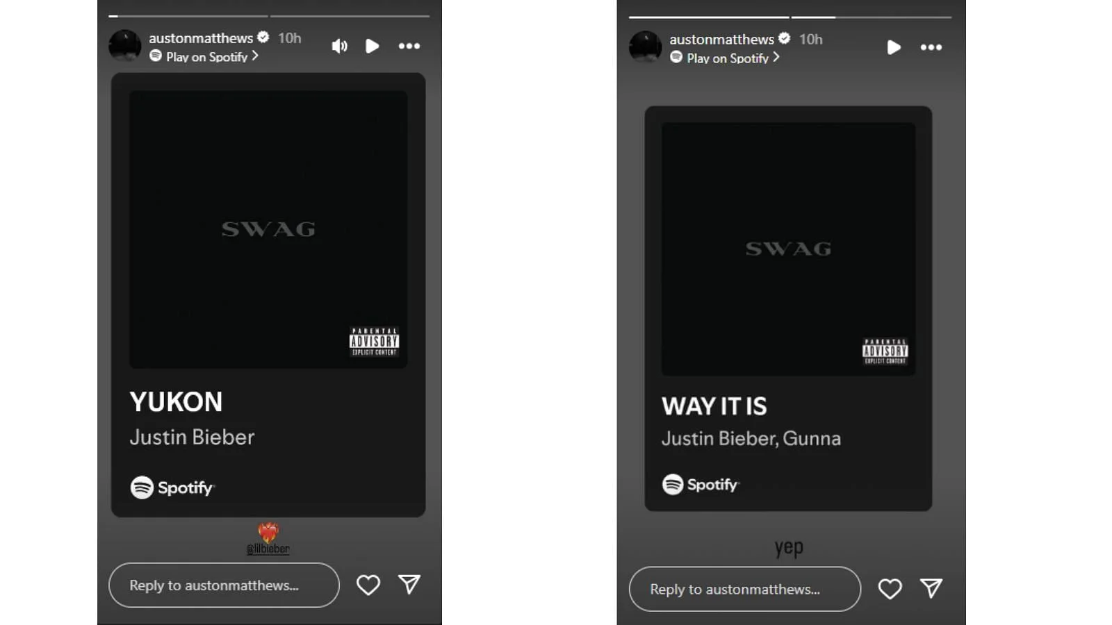 Auston Matthews highlighted his admiration by reposting two songs from Swag, including “YUKON,” featuring the album’s distinct black cover. Matthews tagged Justin Bieber in the posts and added a fire heart emoji to emphasize his excitement. Additionally, he shared the track “WAY IT IS,” which includes an appearance by artist Gunna, captioning it simply with “yep.”