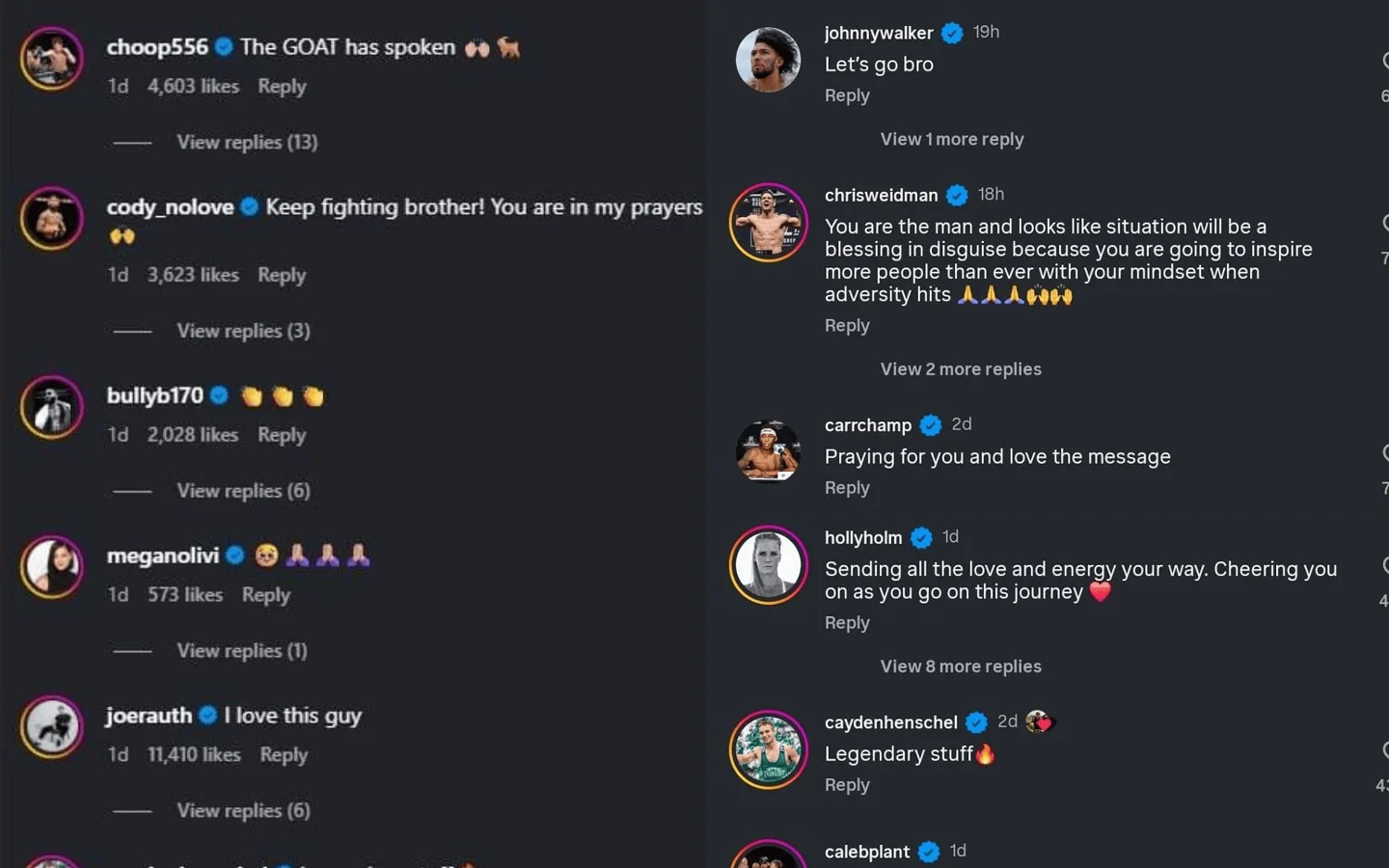 Ben Askren’s updates sparked strong reactions from notable UFC figures. Reporter Megan Olivi responded with heartfelt emojis, while retired fighter Chris Weidman offered words of encouragement:
