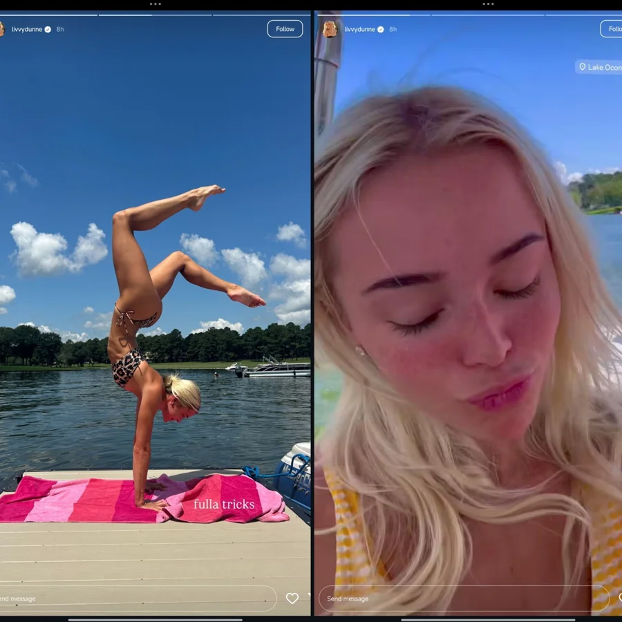 Dunne, who is known for her gymnastics career with the LSU Tigers, revealed more glimpses of her getaway in her Instagram stories, including a striking image of her in a bikini performing a gravity-defying pose against the scenic lake backdrop.
